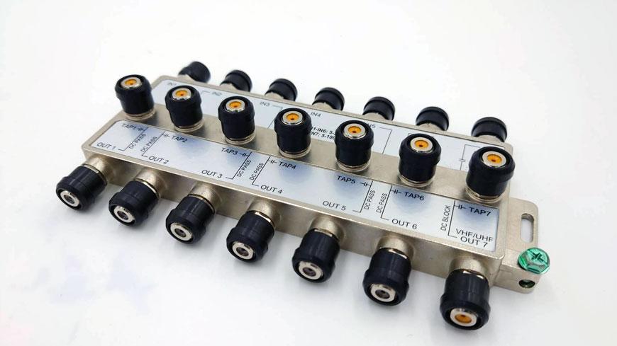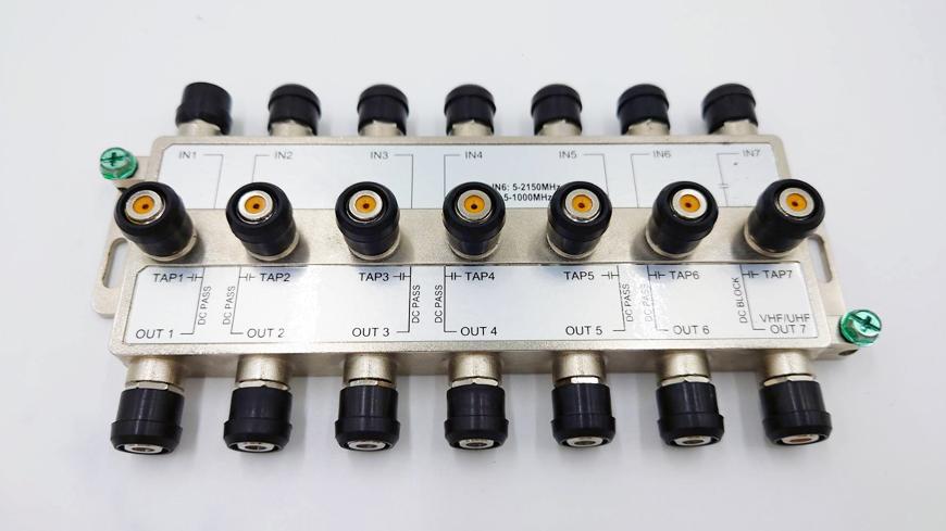 System Impedance 75 ohm Operating IF Frequency Range Satellite ports: 250 – 2150 MHz UHF/VHV port: 5 MHz to 1 GHz Number of Input Ports 7 Total, 6 – satellite ports and 1-UHF/VHF port Number of Output Ports 7 Total, 6 – satellite ports and 1-UHF/VHF port Port to Port Isolation (Input to Output) 35 dB Input Return Loss 12.0 dB, Applies to satellite trunk ports 1 thru 6 only Output Return Loss 12.0 dB, Applies to satellite trunk ports 1 thru 6 only Tap Port Return Loss 10 dB Output Trunk Port to Tap Isolation Loss 20 dB, Applies to satellite trunk ports 1 thru 6 only DC Voltage Loss (output to input port) 1 VDC, Max loss at Max Current DC Power Passing (output to input only) 1000 mA, On Ports 1 thru 6 the DC power only passes from output port to input port (i.e. power flows toward the ODU only) Port 7 (UHF/VHF) is DC Blocked